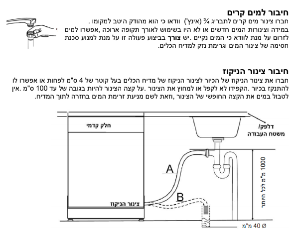 Connect the sink drain pipe to the dishwasher drain pipe having a diameter of at least 4 cm, or alternatively, allow it to drain in the sink. Do not fold or squeeze the pipe. The free end should be positioned at a height of up to 100 cm. The free edge should never be submerged in water for the purpose of avoiding the water from flowing back into the dishwasher.